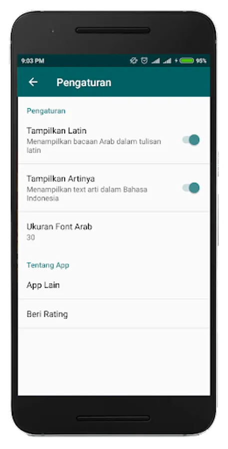 In addition, there are settings to adjust the Arabic font size according to the user's choice. There is also a setting to show or hide Latin text and its meaning.