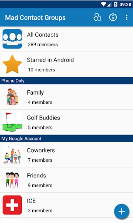 - Create, delete, merge and modify your contact groups (Starred in Android, Coworkers, Friends, ICE, etc.) easily from a great looking material design interface.