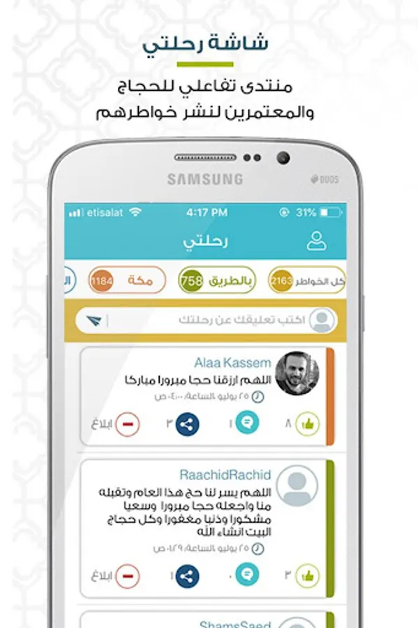 An interactive forum for pilgrims to spread their faith thoughts about their Hajj and Umrah journey, with the possibility of exchanging comments and discussions.