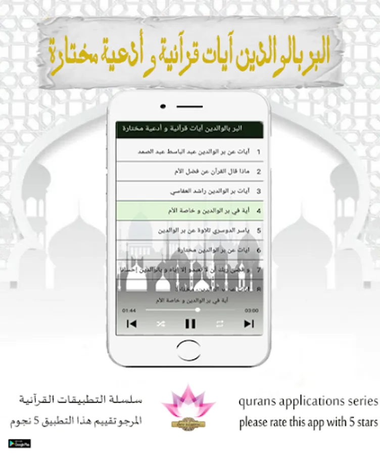★ What are the motives that need `` Righteousness to parents, Quranic verses and selected supplications '', and after installing the application with ease from the store, you will be able to listen to `` Righteousness to parents, Qur'anic verses and selected supplications '' with ease. As for the aesthetic in form, the interface The application of “Righteousness to Parents” verses of the Qur’an and selected supplications is very simple. You will not have any difficulty from the beginning of downloading the program from the store to the arrival of the program, “The Righteousness of the Parents, Quranic Verses and Supplications.”