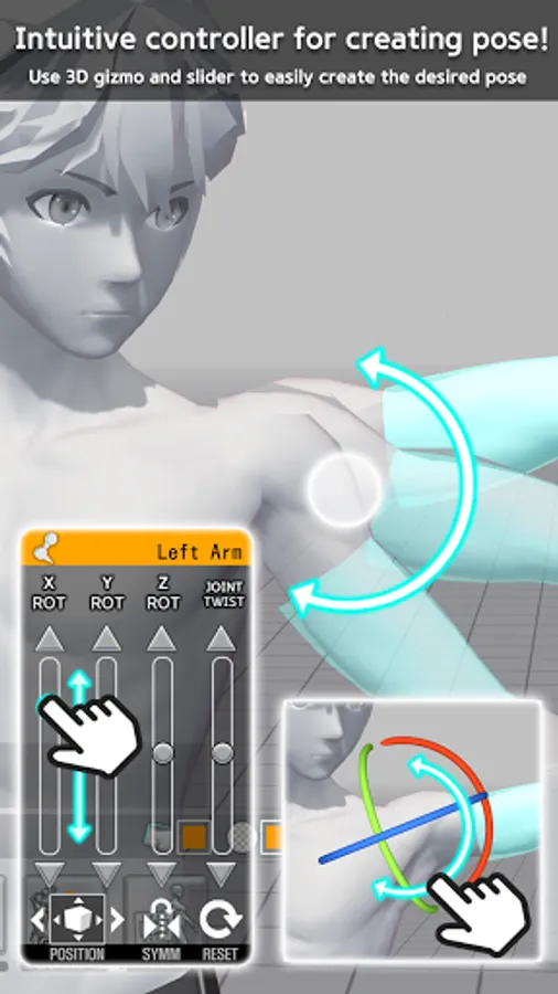 1. Sensitive Operation – Easy Pose allows control over the main joints in an amazingly smooth manner. It provides multiple functions previously unavailable in other pose apps such as a highlight on movable parts, initialization of joints and manipulation state, and finding a symmetrical pose with the mirroring function. Experience controls that are more convenient than with a mouse.