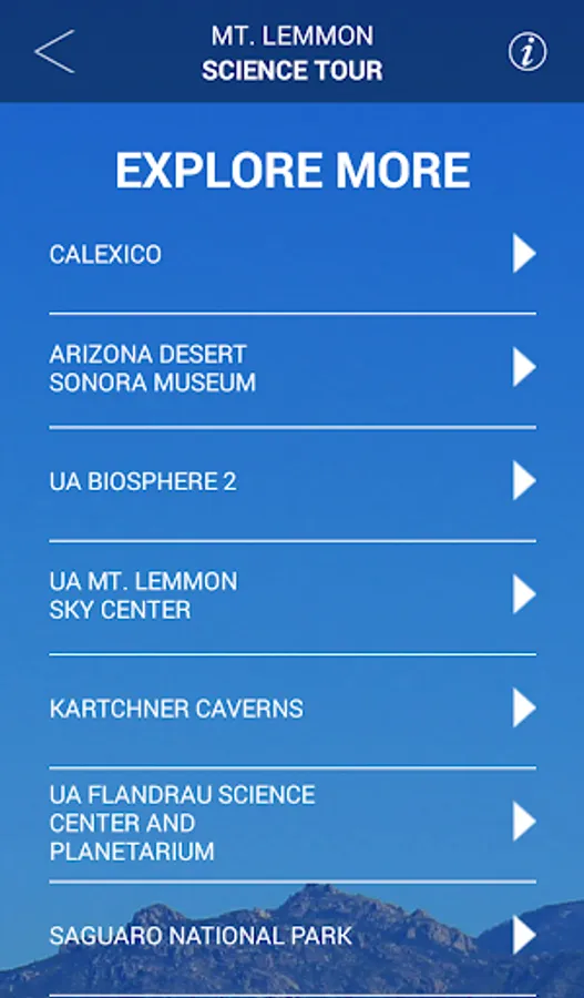 • The EXPLORE MORE screen provides links to other Geotourism opportunities around Tucson, Arizona