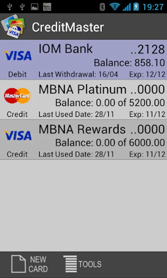 CreditMaster helps you to keep track of your Credit and Debit cards. Check approximate balances at a glance, record transactions instantly, have contact and card details at your fingertips, all from a lightweight app.