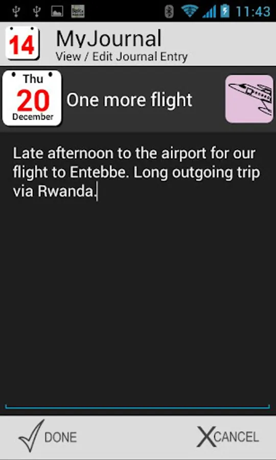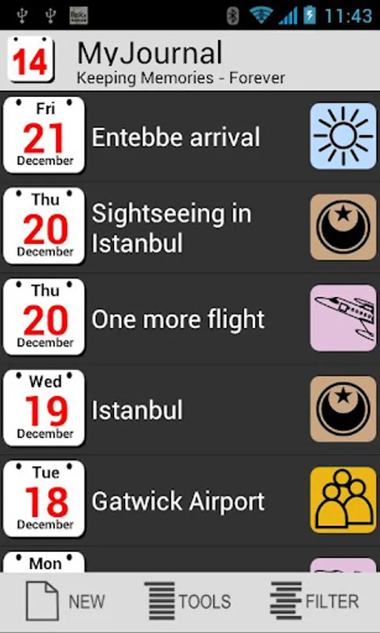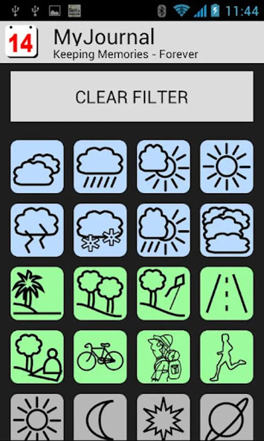 Each entry has a tile and unlimited text space. You also have the option of tagging the entry with any one of 64 different visual tags. These tags can be used later to filter your entries for easier searching.