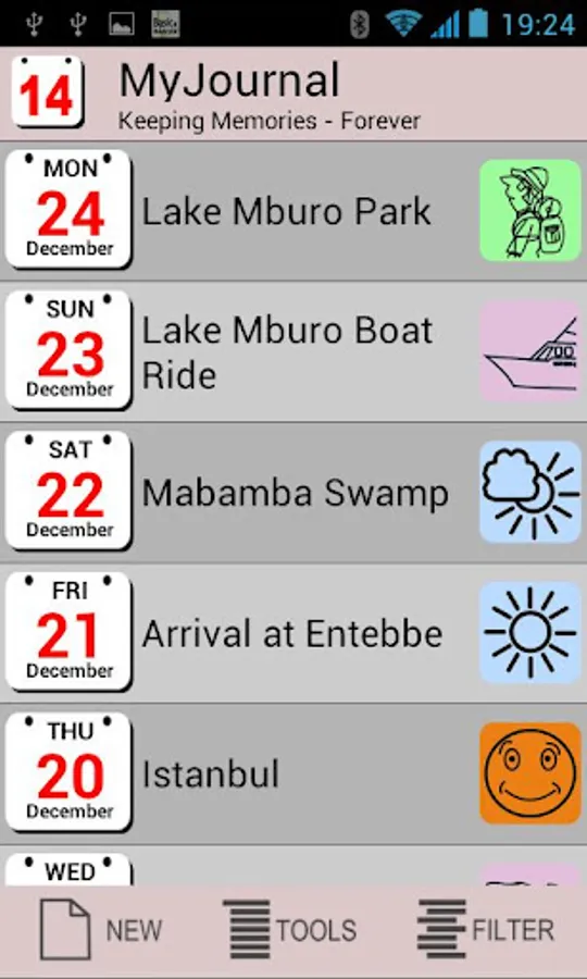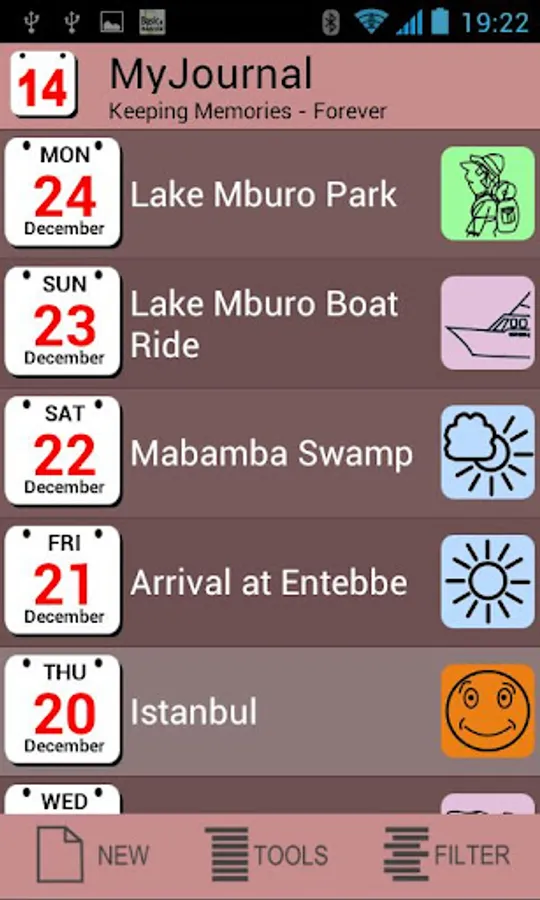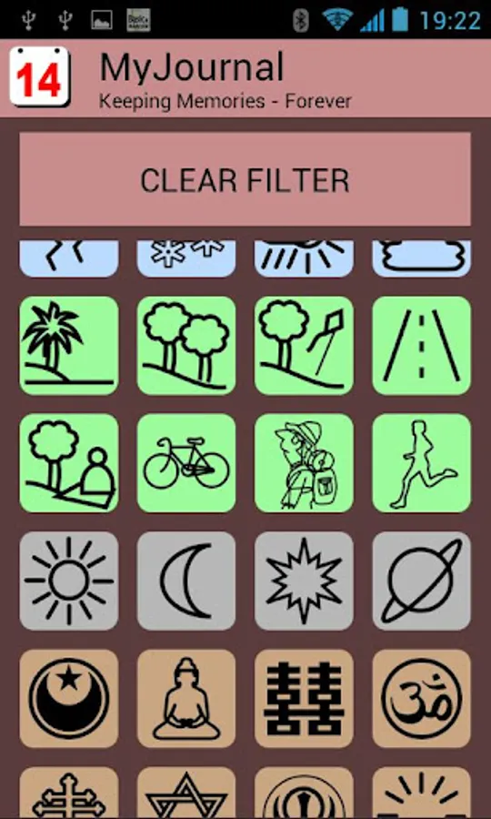 Each entry has a tile and unlimited text space. You also have the option of tagging the entry with any one of 64 different visual tags. These tags can be used later to filter your entries for easier searching.