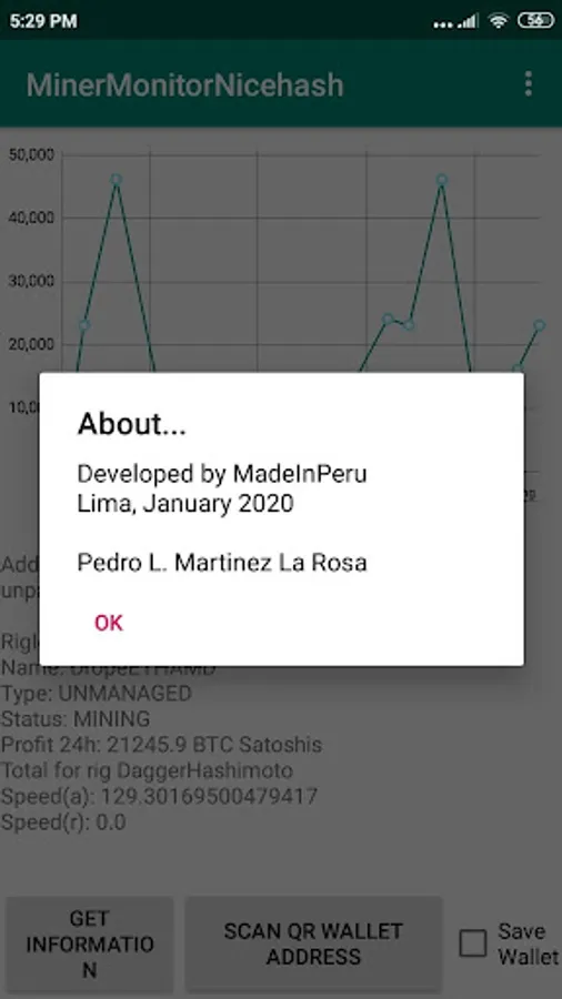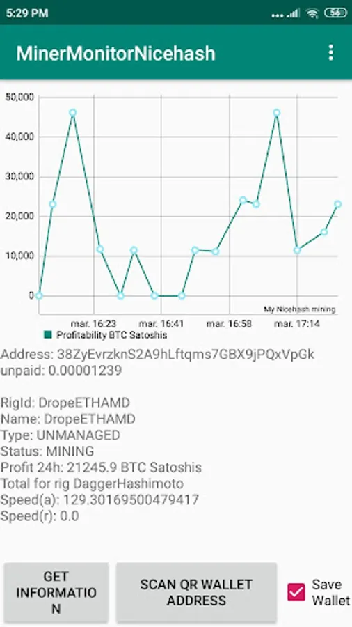 Scan your Nicehash wallet address QR code, save it if you want, the app will use Nicehash API to get your information: Mining rigs, Algorithms, Speeds, Unpaid amount