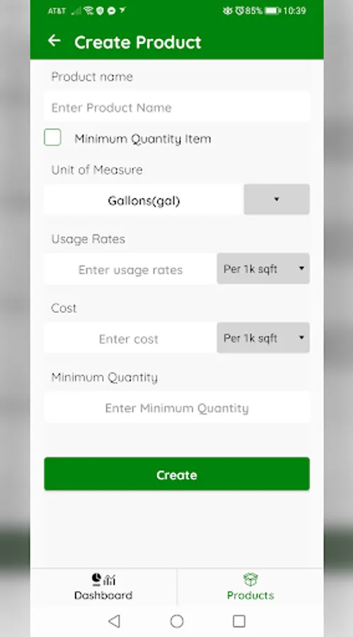 Invntry is a green-industry inspired product management application. To create your product, enter it's name, unit of measure, set usage rates and cost. If you must have a minimum quantity of the product at any given time, set the product as a minimum quantity item using the checkbox and enter the minimum amount to keep on hand. Once your products have been properly entered, you may utilize the dashboard. This is where you will monitor your current inventory and determine how much product you need at-a-glance.