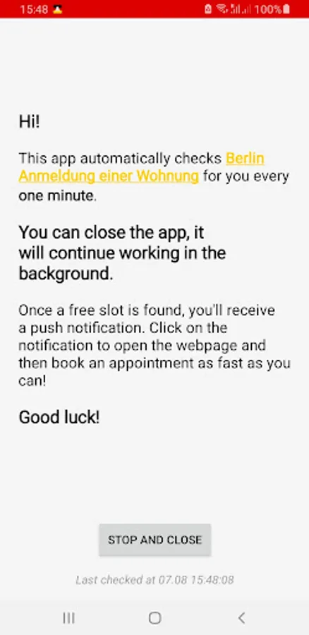 When you receive a notification, just click on it to open a browser with the timetable and book the "Termin" (appointment) yourself.