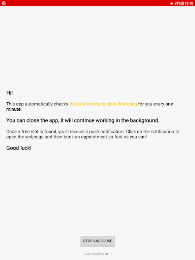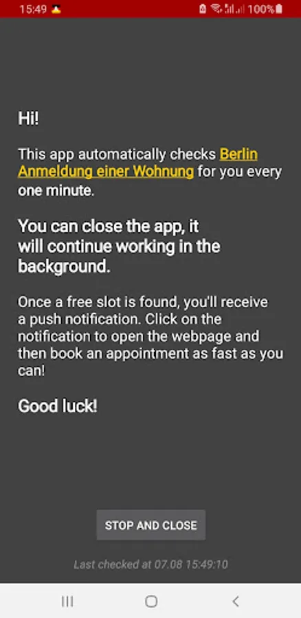 It makes a check once per minute for you and sends a push notification when a free slot is found. It can work in background. Can be stopped anytime with "Stop and close" button.