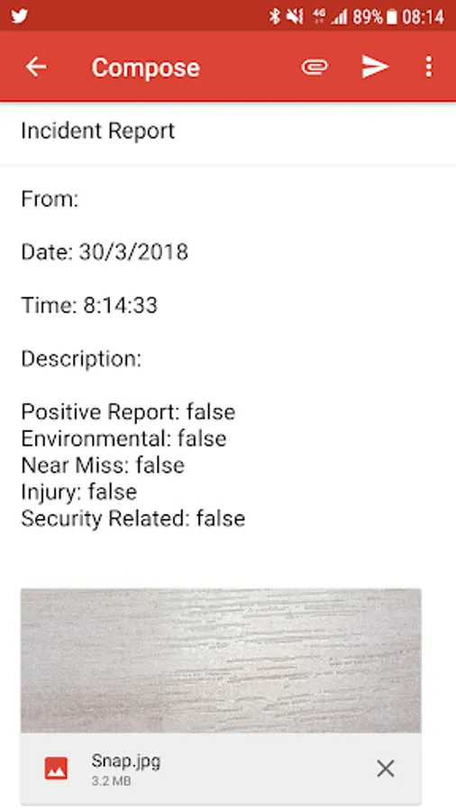 The 'Incident Reporter Pro' App collects the data from the report and sends it via your employees email address (registered to their phone), with the photograph you have taken in-app, automatically to an email address of your choice, i.e. Incidents@YourBusiness.com.