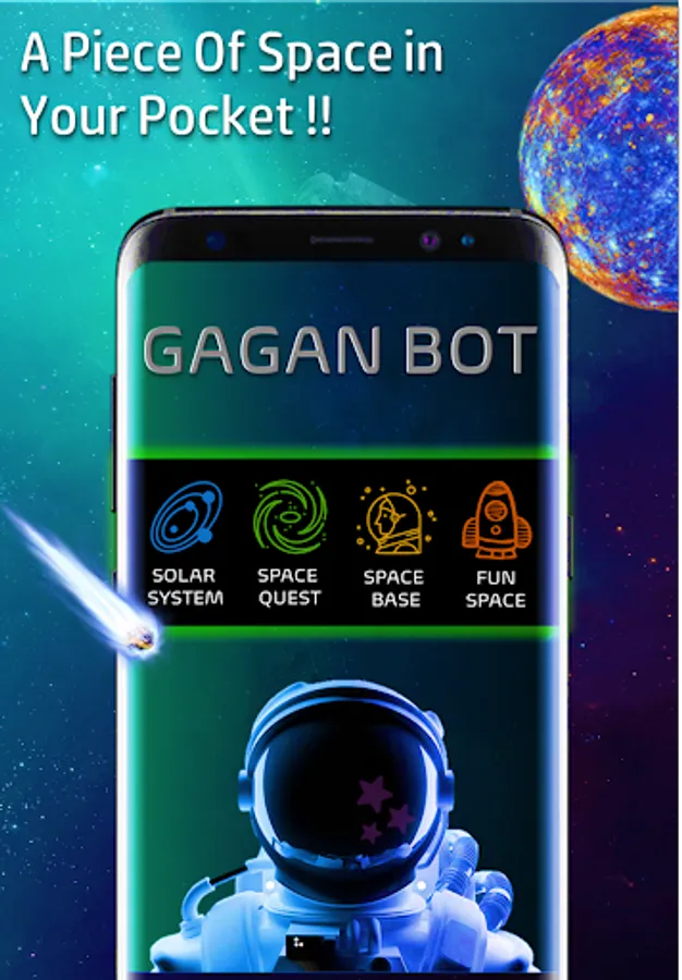 Space amazes everyone, but it is sometimes difficult to get a notion of the extreme measurement units. With a very easy to use interface, Gagan Bot helps the user to get a feel of the extreme distances, weight, and sizes. Check how much you weigh in different planets, how far the planets are and how big they are in solar system section. The Space Quest covers the sounds from space, stellar size comparison and more interesting topics on interstellar space. Space Base section I covers facts on Indian Space Saga, Space Book Collection and virtual tours on space related areas. Checkout how fast your city is spinning, live track the international space station, experience the size of big rockets and more. Check your space knowledge by participating in Gagan Quiz and earn badges.