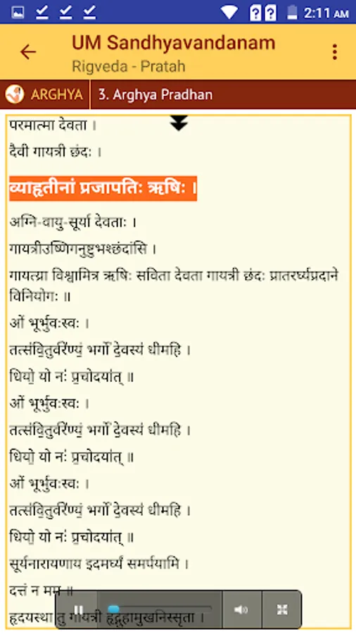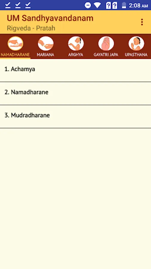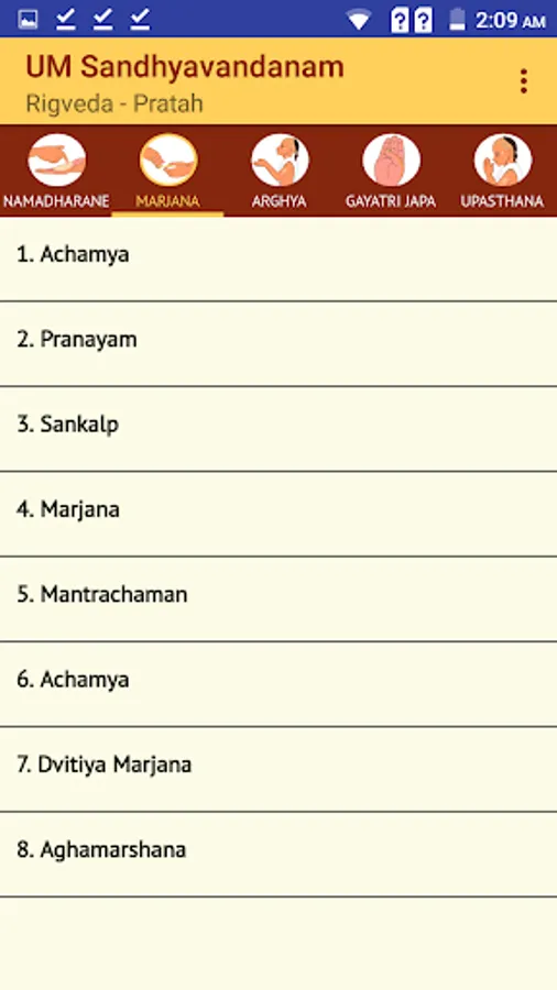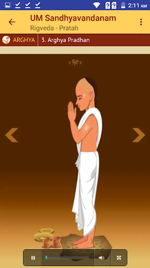 UM Sandhya application provides simple and easy to learn interface for learning Sandhyavandam kriya for all level of learners using mobile device. The application incorporates animated video covering detailed steps of performaing Sandhyavandanam kriya. The animated video is assisted with audio and lyrics which go in sync with animated video helping users learn actions, pronunciations, text for all the steps involved in the kriya.