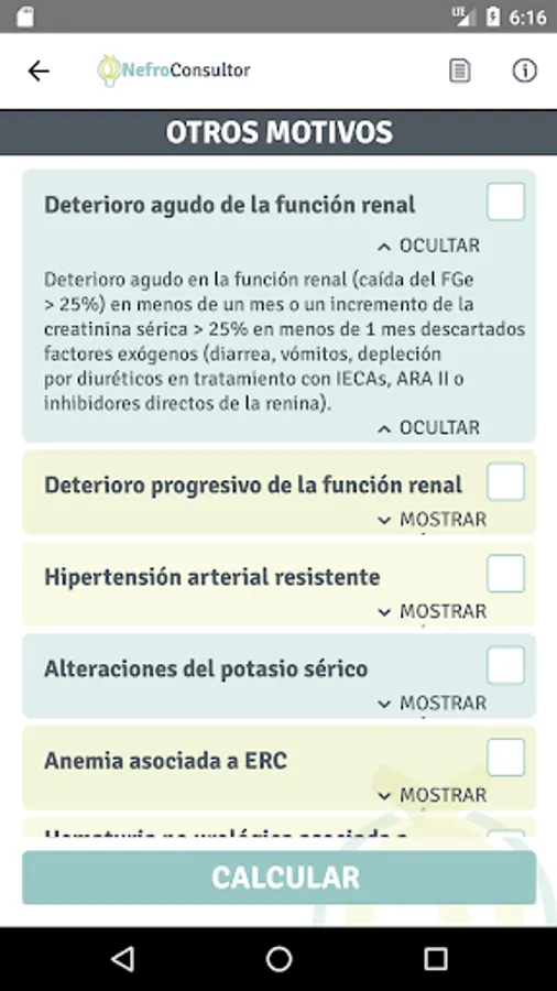 This application has been developed by specialists in nephrology, working in the area of clinical nephrology and Primary Care and Support is directed exclusively to doctors, but has been raised as a free mobile application, unrestricted users and not required by the user registration. At no time personal data or user of patients are required, which does not breach the Data Protection Act. The size of the app is about 16 megabytes and use, a connection to the Internet, except when the downloaded application is not required.