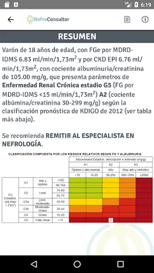 NefroConsultor is an application developed by specialists in Nephrology and addressed to primary care physicians and other specialties, with the intent to help them in making the decision to refer a consultation for a patient to be evaluated by the nephrologist and treat a patient with chronic kidney disease. Based on the Consensus Document on Chronic Kidney Disease (November 27, 2012) and other literature sources in the same query with the patient in less than 30 seconds, incorporating only 4 parameters (age, sex, serum creatinine and albuminuria), the program will be able to indicate the estimated Filtering by CKD-EPI formula and MDRD-IDMS, the degree of chronic kidney disease according to the prognostic classification of KDIGO 2012 guidelines, the corresponding relative risk adjusted for Glomerular five events (mortality Overall, cardiovascular mortality, renal failure treated with dialysis or transplantation, acute renal failure and progression of renal disease). Also, the program will indicate if the statement aforementioned consensus patient has indication being sent to the Specialist in Nephrology, or whether it should be followed by their primary care physicians, in addition to providing clinically relevant information to make appropriate medical decisions " foot of consultation. " Plus a series of recommendations on the monitoring of the patient should be performed taking into account their stage of renal disease, and in the section "Other Recommendations" specifies everything that the PC doctor has to take into account when ago assessing a patient with CKD, where recommendations on dietary habits, controlling blood pressure, treating diabetes mellitus, control and treatment of dyslipidemia, hyperuricemia and anemia, recommendations about medication and also include the frequency and monitoring of these patients. Finally, the consensus document in which the application is based, is available from the app ibook or pdf format, among others, so that the user can check in any time you want.