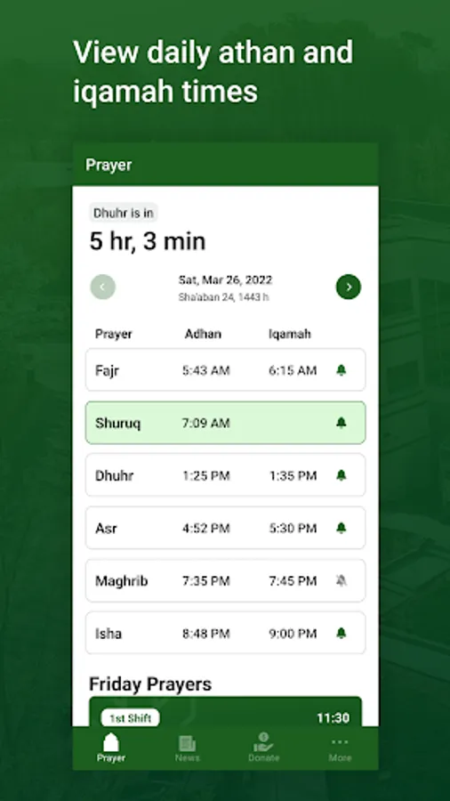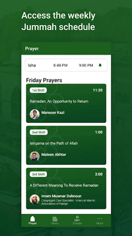Three shifts of Jummah (Friday) prayers are held in order to make it easy for all to attend the Friday prayers and the late timings of the third shift of Friday prayers are targeted specially for Muslim students to attend prayers after regular school hours.