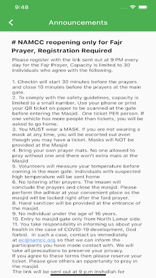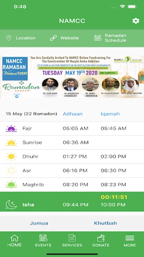 NAMCC also offers basic services like marriage (nikkah), family counseling services, sadaqah (charity) and zakat services helping over 100 needy families and individuals each year, funeral services, and accommodations for Ramadan, where we serve iftar 7 days a week, perform taraweeh prayers, offer Itika’af, Eid prayers and Eid picnics.