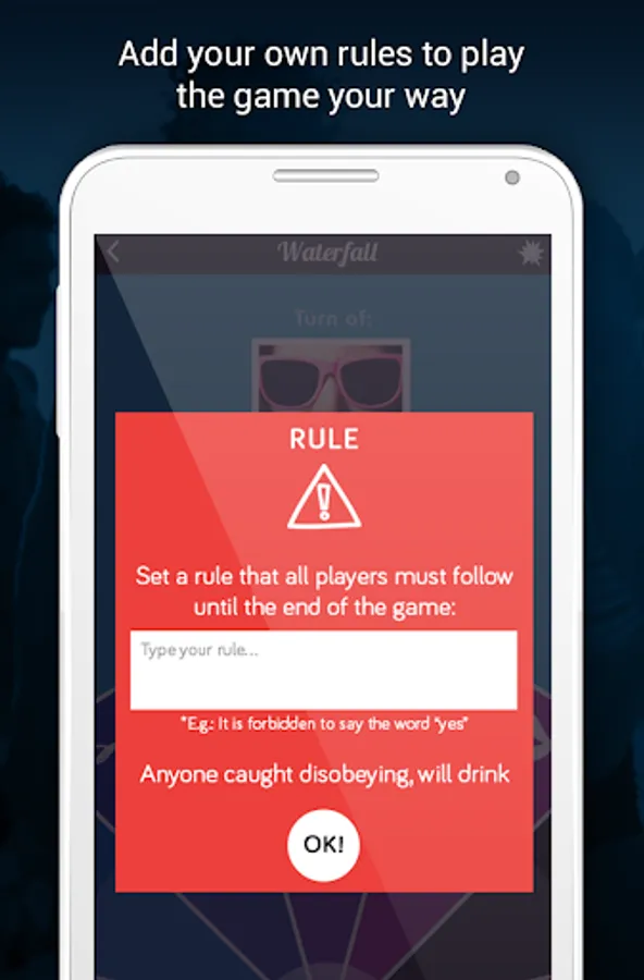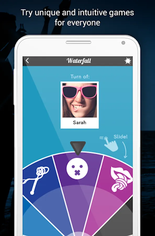 ✔ WATERFALL: Spin the wheel and follow the rules, if you do not, you must drink. The Prisoner, The Rule, I have never ever..., Truth, Challenge... Try our spinning wheel!