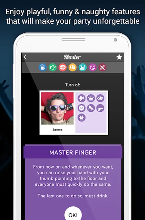 ✔ MASTER: Haven’t had enough? That’s because you haven’t tried our Master Game yet. All that you have been looking for, in one game. More challenges, more fun, more drink. Warning: It’s really addictive, this is why we call it "The definitive drinking game".
