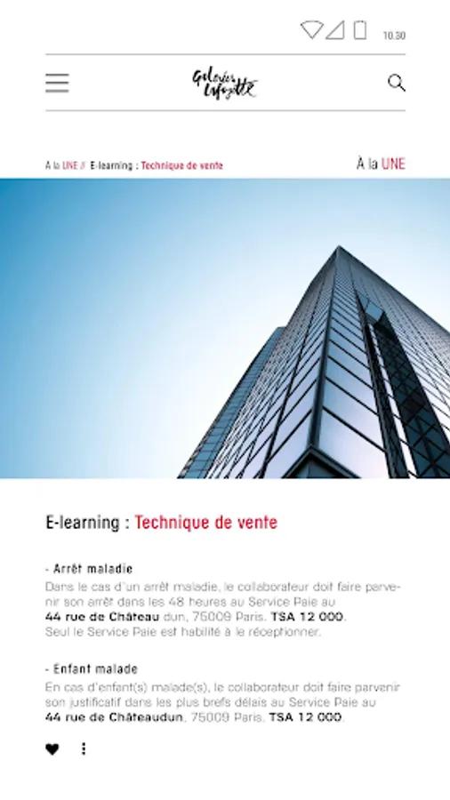 This application contains all the practical information of the Galeries Lafayette Haussmann store (organization charts, brands, services, etc.) in order to allow employees to perform their work to the best of their ability and improve customer service. It also contains strategic, commercial and event news from the store. This is an application exclusively intended for employees of Galeries Lafayette Haussmann.