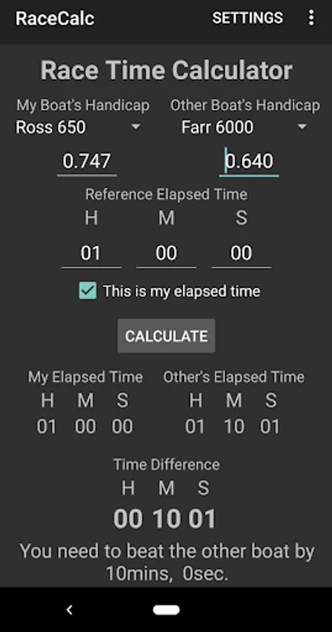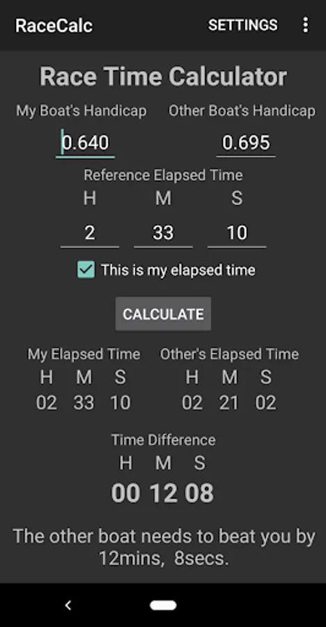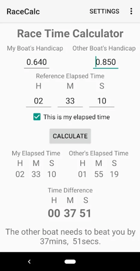 Calculates elapsed times from handicaps for two boats and shows which boat needs to finish ahead of the other and by how long.