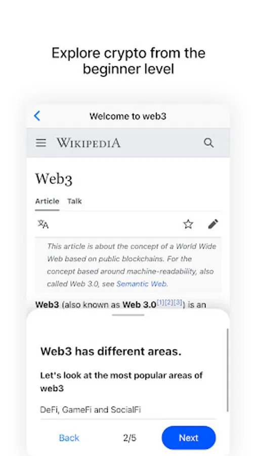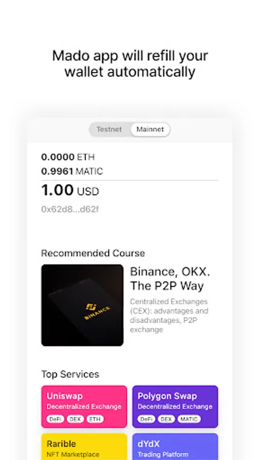 Learn about NFT, blockchains, bitcoin, Ethereum, ripple, and Polygon. Complete interactive courses, try web3 services and learn crypto. Mado refills your wallet automatically.