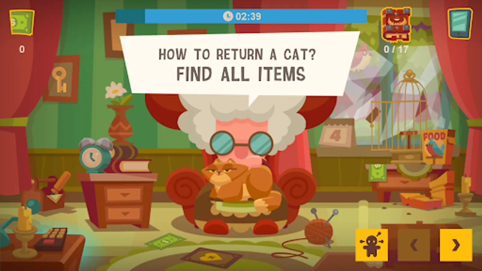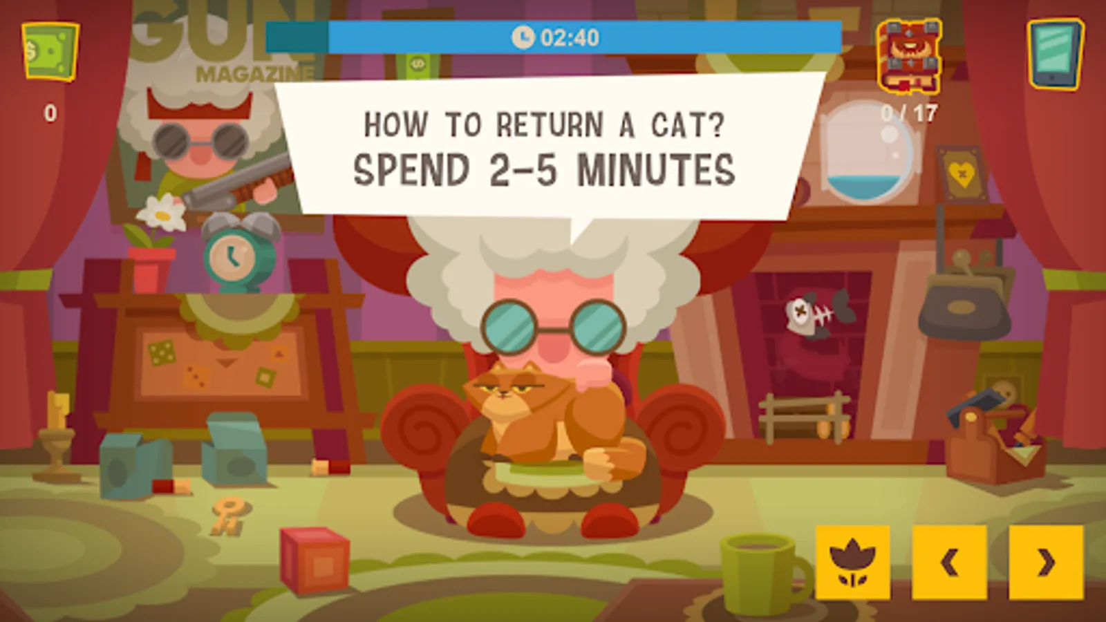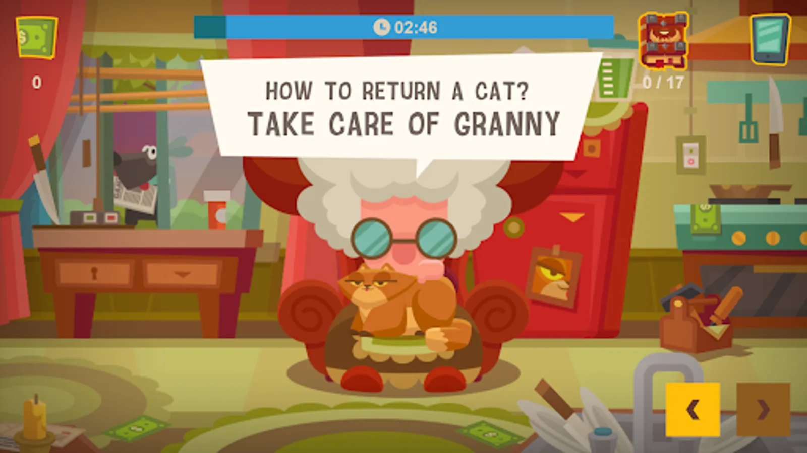 The game will take us to the cozy house of a cute granny and her cat. One evening, granny mistakenly summoned a demon from the underworld that possessed her beloved cat with the help of an old demonic book. Now, the cat from hell threatens granny and doesn't want to leave. By solving simple puzzles and collecting the necessary items, you need to help send the demon back to hell and return your pet.