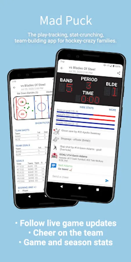 Every hockey team has an extended hockey family; a group of dedicated parents, relatives, friends, and volunteers who make the game fun for those on the ice. With Mad Puck, the hockey family can work together to track every game, every big play, and every goal!