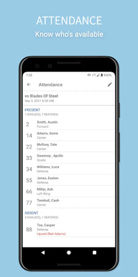 Multiple options allow you to control how attendance is managed - require attendance responses for every event or just events that players can't make.