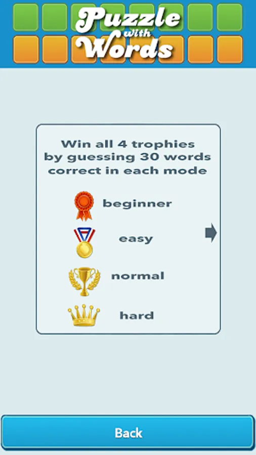 The goal is to win all trophies. Solve 30 words in a row to earn a trophy! (more trophies will be added)