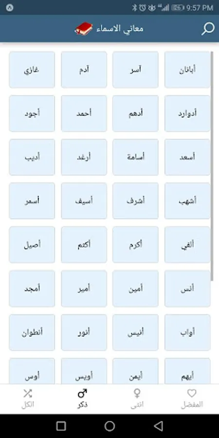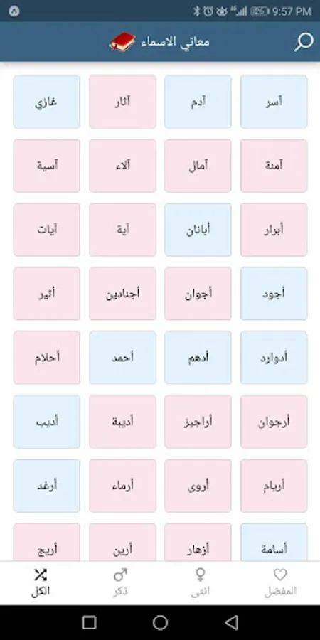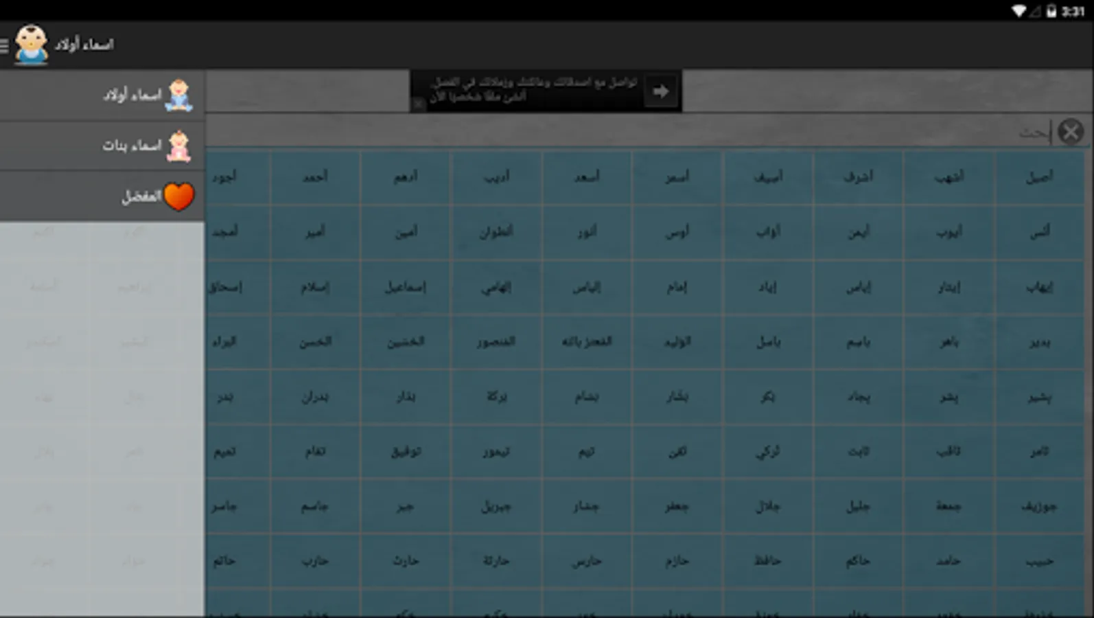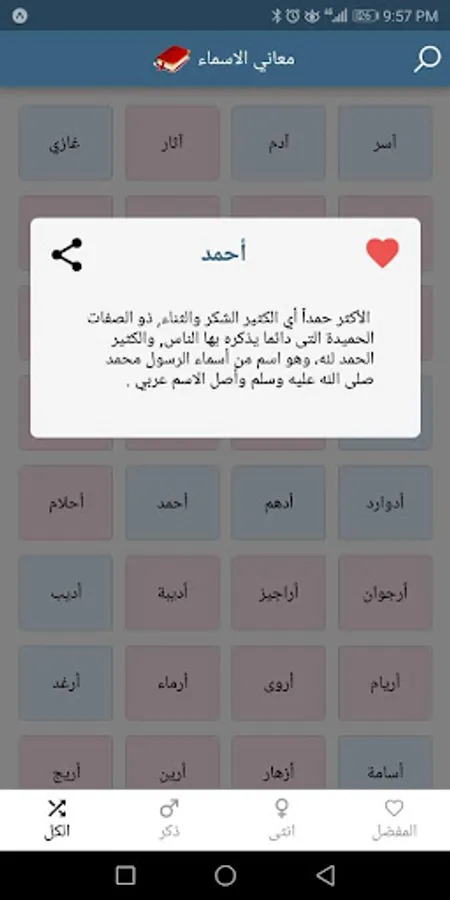برنامج يحتوي على مجموعة من اسماء الاولاد و البنات و معانيها الجميلة مع إمكانية المشاركة و إمكانية انشاء قائمة بالاسماء المفضلة