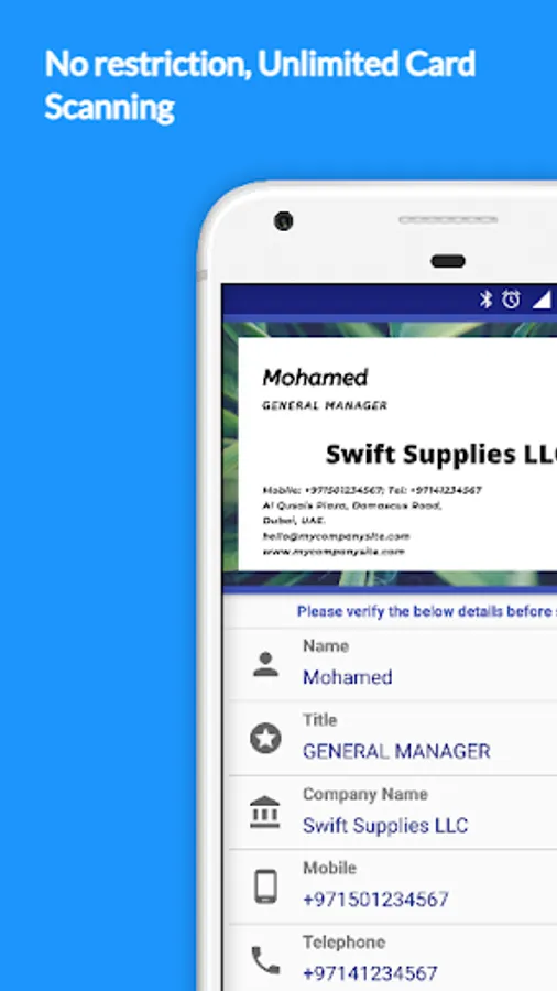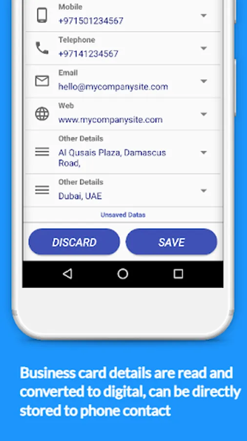 * Business card details are read and converted to digital, can be directly stored to phone contact.