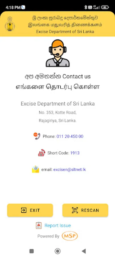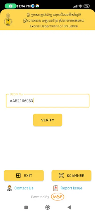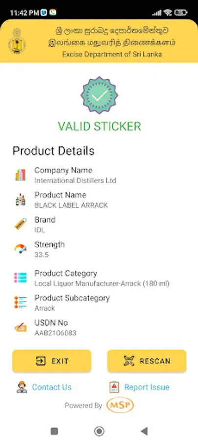 Tax Stamp Validator App scans the 2D Barcodes on the Products as well as option to enter the USDN No. of the Products approved by Excise Department of Sri Lanka and provides whether it is valid or invalid product. If the product is genuine, then this App provides following information about the product