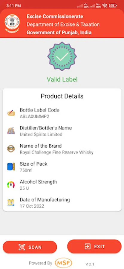 Excise QR Code Label Citizen App, scans the 2D Barcodes on the Products approved by Department of Excise & Taxation, Government of Punjab, India and provides whether it is valid or invalid product. If the product is genuine, then this App provides following information about the product