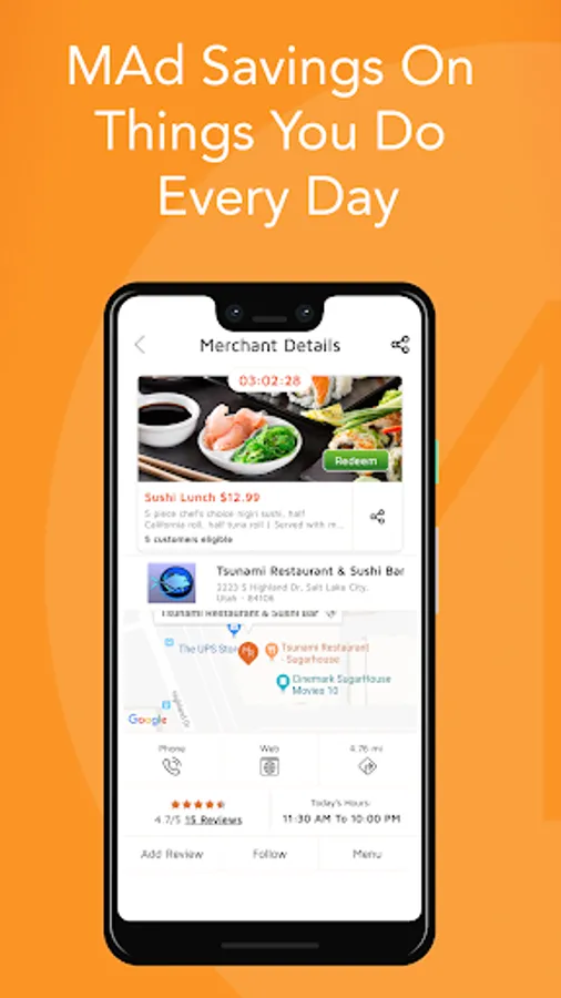 Save money with the best deal finder app for local restaurants! The MAd Reach™ app is the deal finder with exclusive coupons and time-sensitive deals based on your location! Unlike Groupon & RetailMeNot, the MAd Reach™ app only shows you deals from local restaurants near you. Lunch is served and it’s a deal!