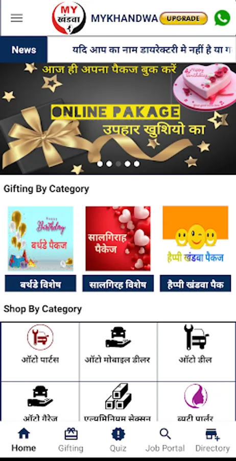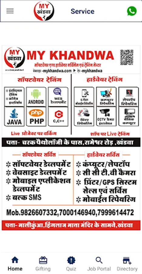 खंडवा जिले का पहला ऑनलाइन गिफ्टिंग पोर्टल , ऑनलाइन बिजनेस डायरेक्टरी एवं जॉब पोर्टल.. जिसमे आप अपने प्रियजनों के विशेष दिनो जैसे जन्मदिन ,सालगिरह या अन्य शुभ अवसरों पर उनके लिए घर बैठे एङवास मे आकर्षक गिफ्ट पैकेज व गिफ्ट ऑनलाइन बुक करे, वो भी फ्री डिलीवरी के साथ ,साथ ही ऑनलाइन ङायरेक्टरी के माध्यम से खंडवा के मोबाइल नं की जानकारी भी प्राप्त कर सकते है , एवं फ्री जॉब पोस्ट भी कर पाएंगे.