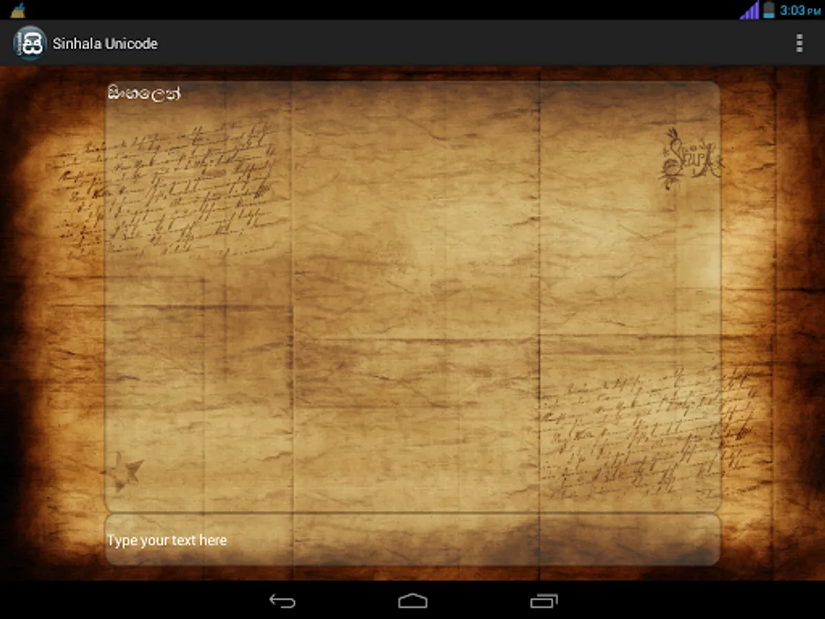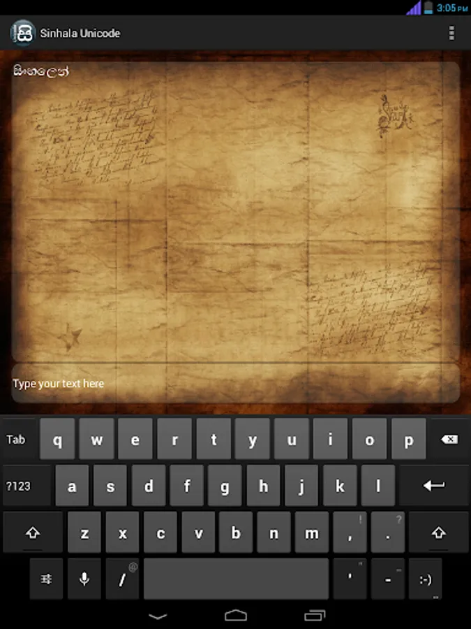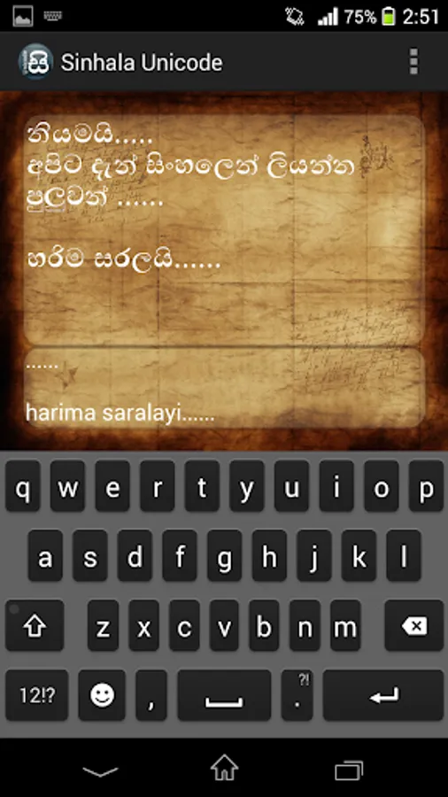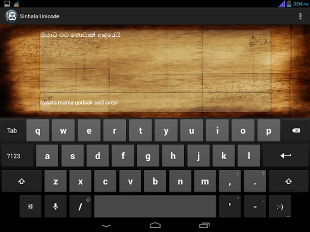 Sinhala Unicode is a sinhala unicode writing app for your Android device.This application will help you to type whatever you want in Sinhala just like you are typing an SMS.