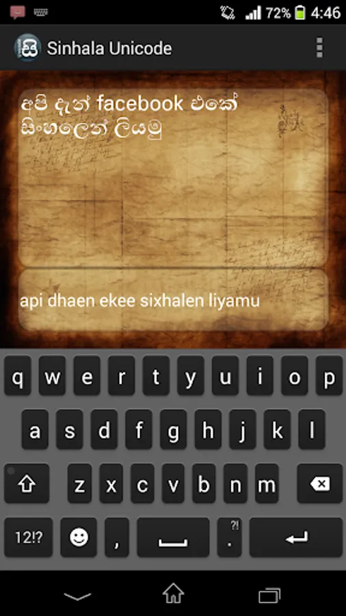 It is very easy and simple to use.All you have to do is type in your text with English keyboard, meantime app transliterates this text in to Sinhala for you Offline. After you type your post, status, email in Sinhala you could share it with your friends within app it self.