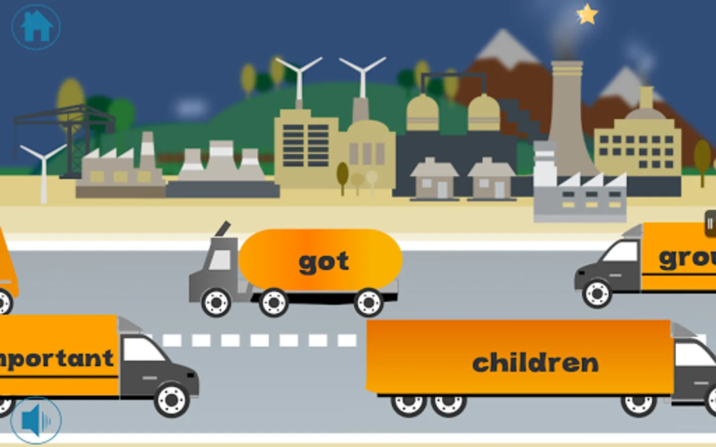 Reading Highway - Trucks drive through carrying words. Status bar displays a sparkling star for each correct answer.