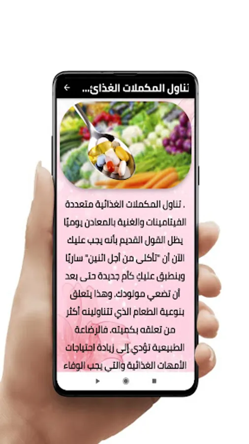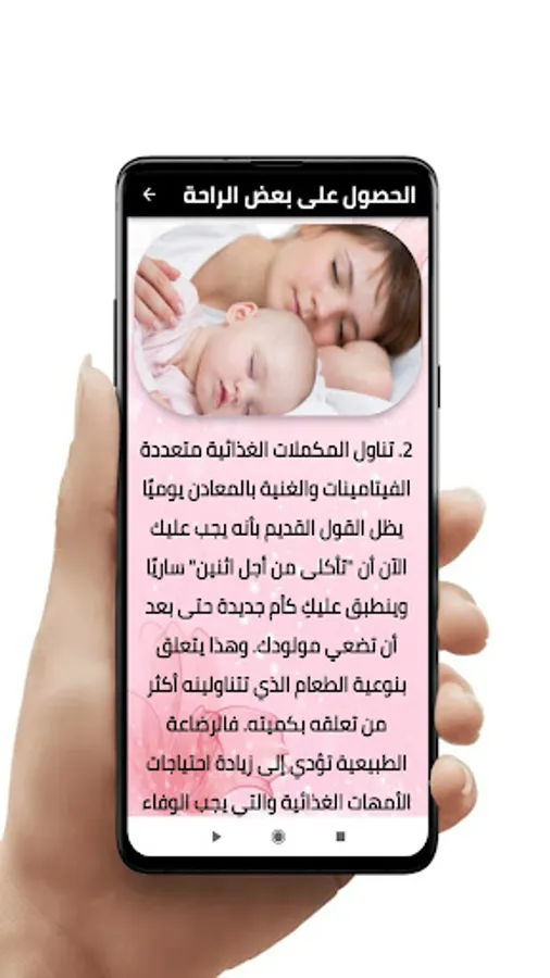 Health information for new mothers This application contains a lot of useful information about the importance of taking care of her mental and physical health and how to overcome all the difficulties she faces at this stage.