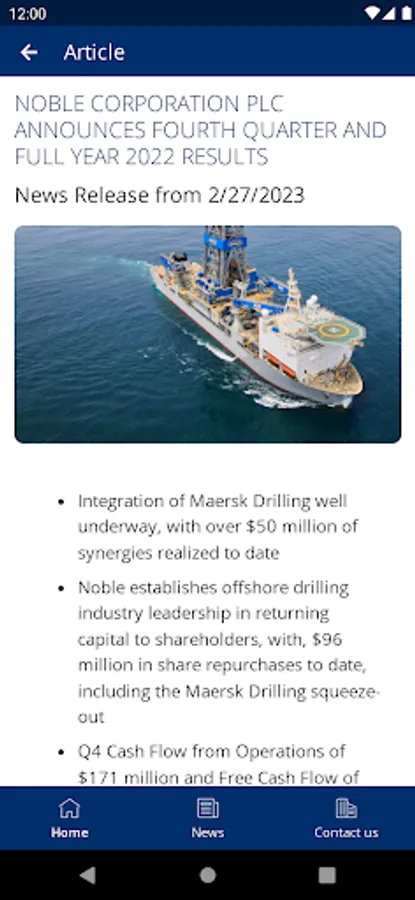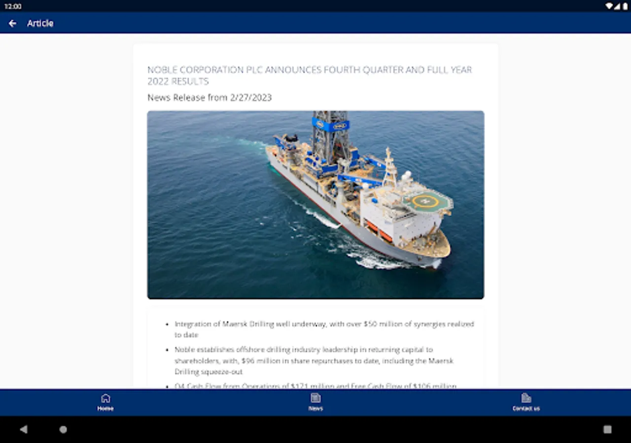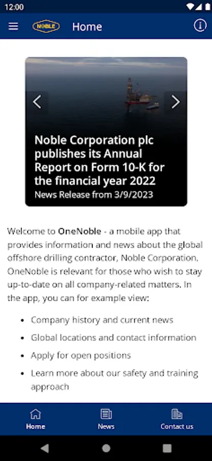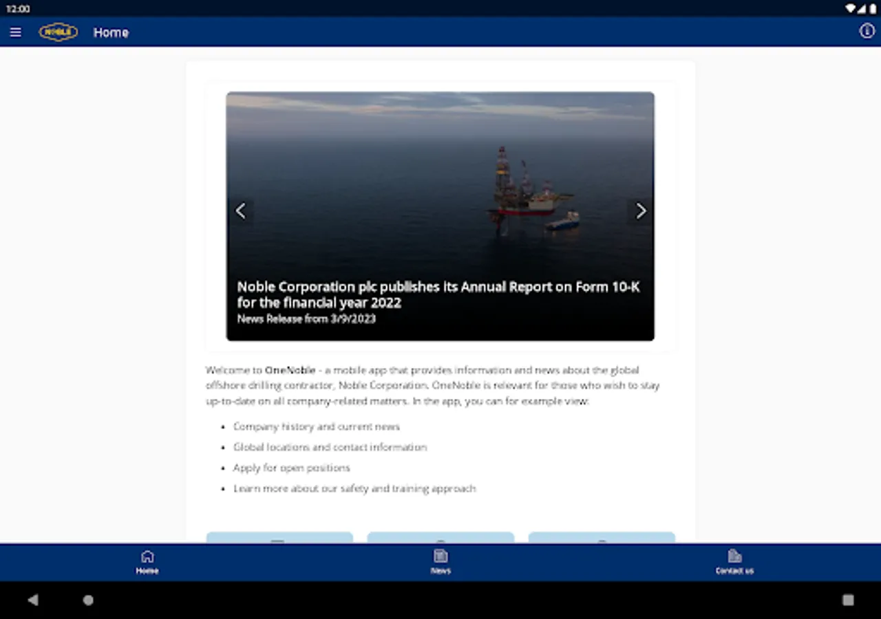Welcome to OneNoble - a mobile app that provides information and news about the global offshore drilling contractor Noble Corporation. OneNoble is relevant for investors, customers, partners, and employees, who wish to stay up-to-date on company-related matters.