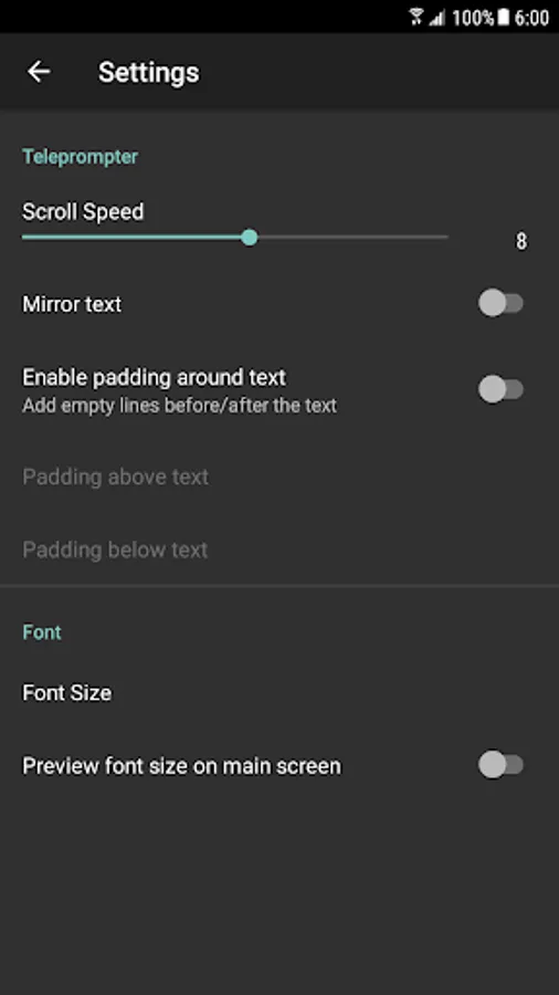 Settings include the ability to change scroll speed and font size, text mirroring, and the option to add empty space padding before and after the text. This padding will allow you to get adjusted if you need extra time before the text starts scrolling (for example, to allow time to get positioned in front of a camera).