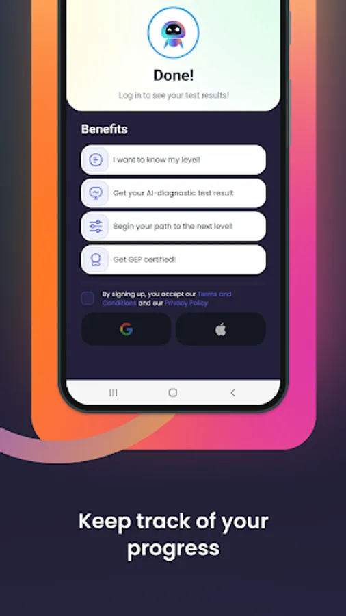 Know your English level with a high degree of accuracy in just 10 minutes, using our Artificial Intelligence (AI) powered test. You have constant monitoring of progress, and certify yourself by taking our GEP English Exam with which you will be able to accredit your level. All this and much more you will find here!