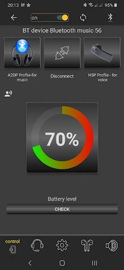 With the "Bluetooth Music Lite" application, you can quickly find out the battery level of the headset.