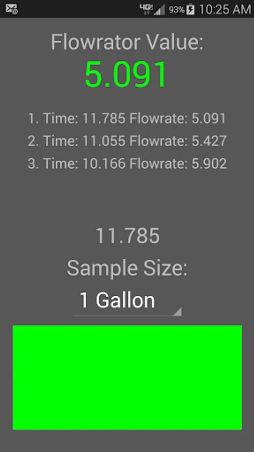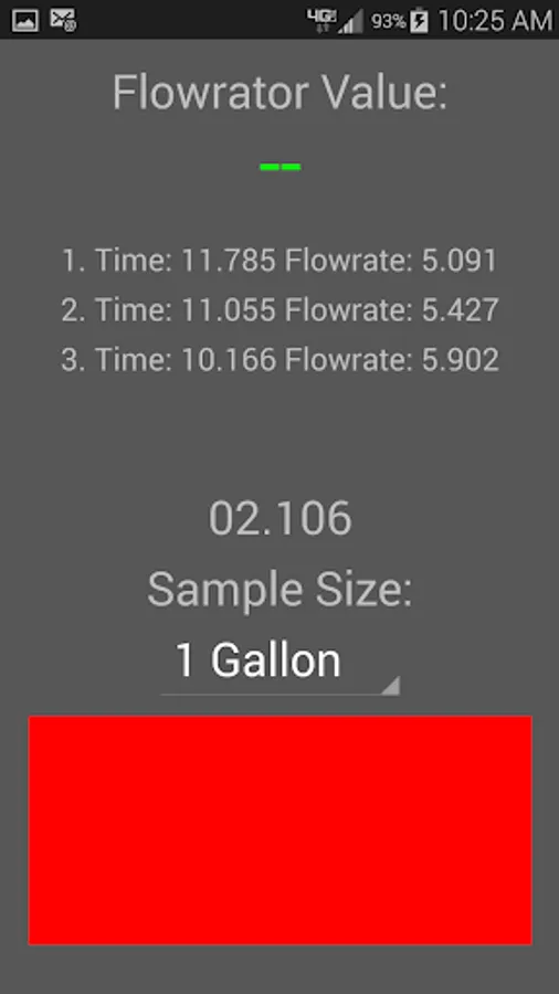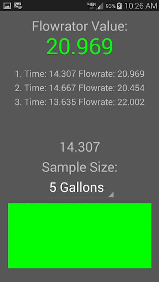 Flowrator helps you determine the flow rate of a gasoline dispensing facility. You can use a sample size of 1 through 5 gallons. The application will also display your last two calculations and their time. It is as easy as hitting the green button to start it and the same button (red) to stop it.
