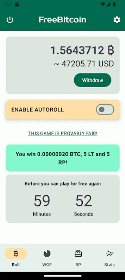 Background Roll Activation: Activate the app in the background and let it perform the hourly rolls automatically, while consuming minimal battery power. Never miss out on a chance to boost your Bitcoin balance.
