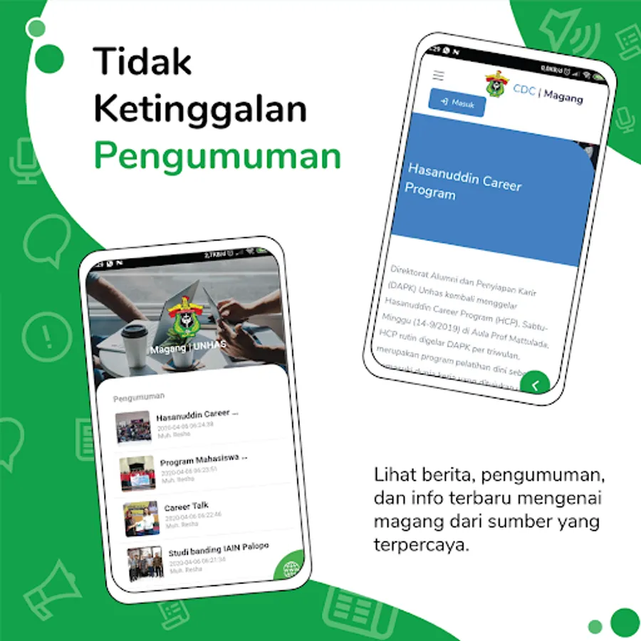 Aplikasi Magang untuk Mahasiswa Universitas Hasanuddin, dibuat untuk memudahkan dalam hal pengelolaan kegiatan magang, mulai dari registrasi mahasiswa dan pengriman berkas, seleksi mahasiswa, penempatan mahasiswa, pengisian kegiatan harian mahasiswa magang sampai pelaporan untuk pengelola magang.