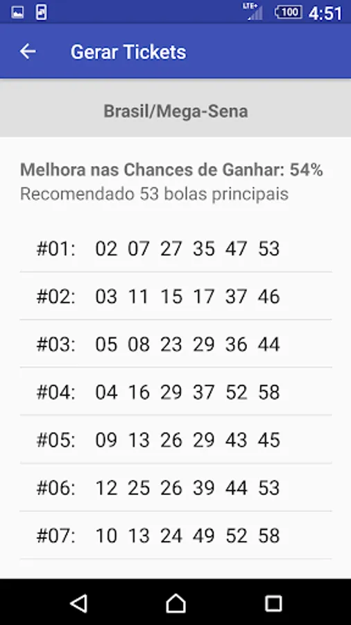 The magayo Lotus application was developed for those who want to create tickets to play. For a more precise analysis and tips with various statistics, consider downloading the Lotus magayo Computer / Windows notebooks. Learn more at https://www.magayo.com/pt/