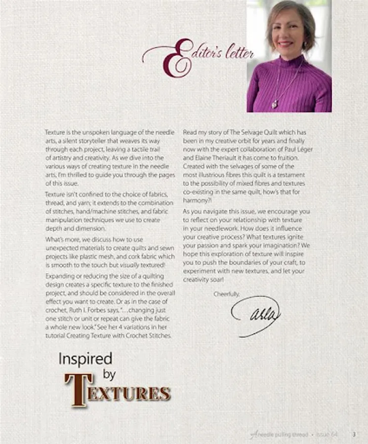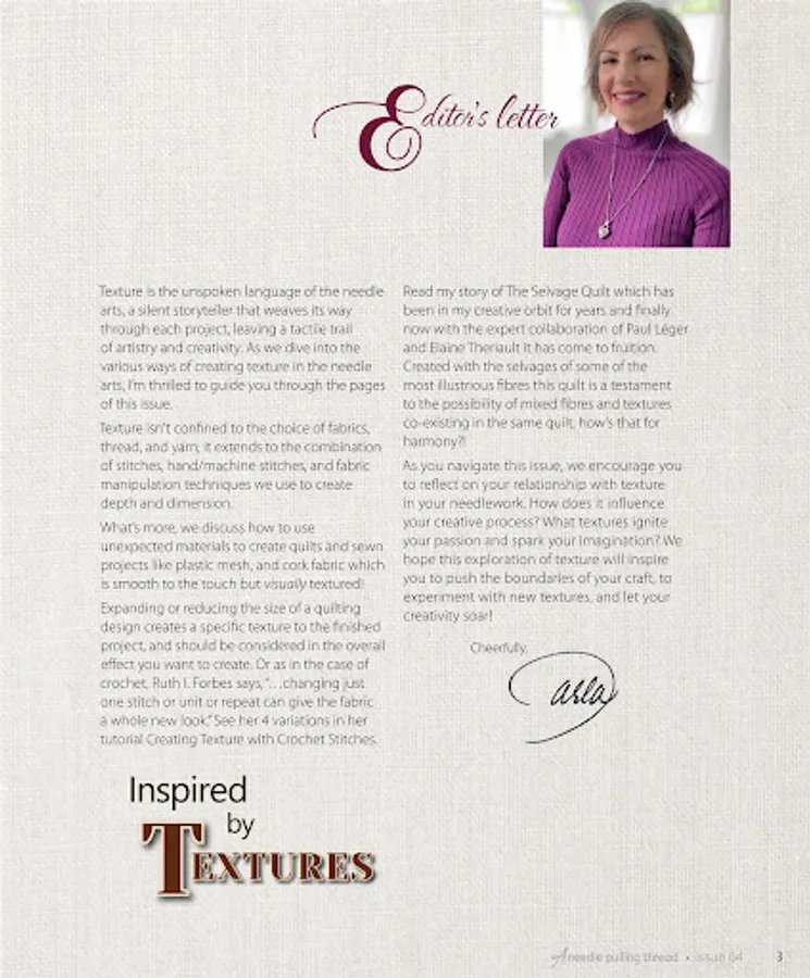 A quarterly magazine that encompasses a wide variety of needlework in every issue: quilting, knitting, cross stitch, embroidery, crochet, beading, rug hooking, fibre art, sewing, and more. It includes projects with full instructions and stunning photography, as well as informative articles on trends and techniques, and needlework show reviews. Each issue is 100 pages or more in full colour.