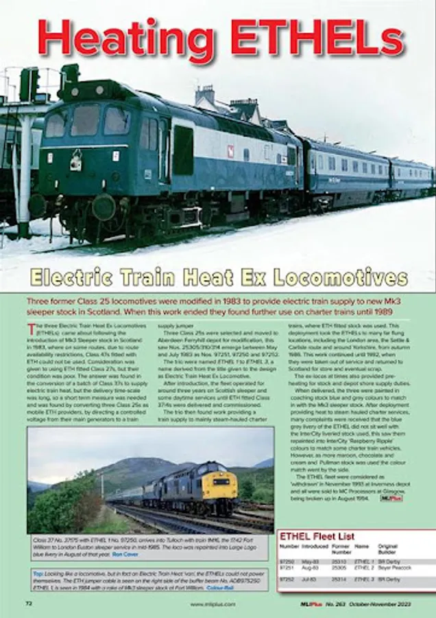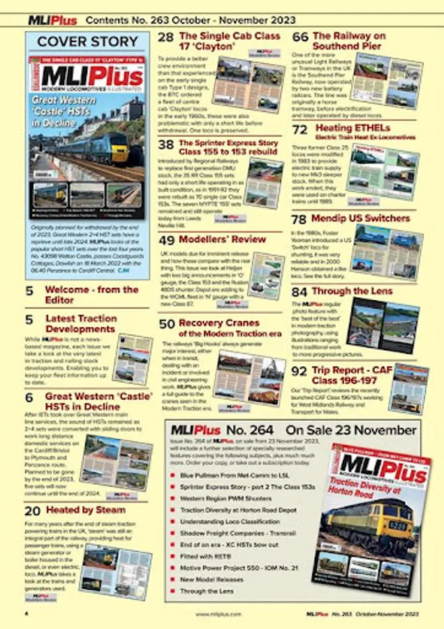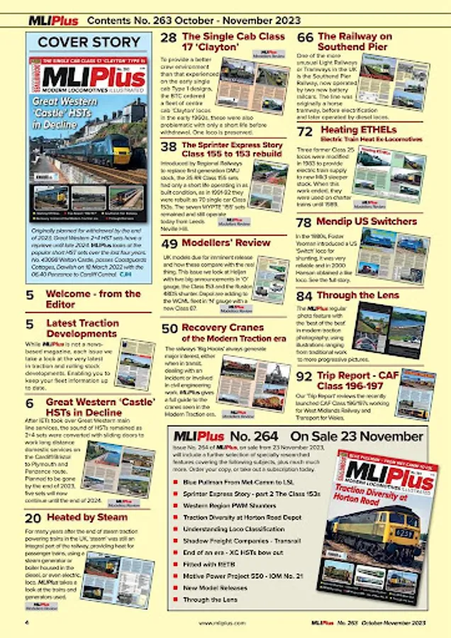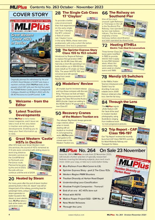 MLI Plus is a bi-monthly modern traction magazine, dedicated to recording the development, operation and disposal of the UK diesel and electric fleets. First published in June 2008, Modern Locomotives Illustrated covers all modern traction classes of locomotive and multiple unit trains.