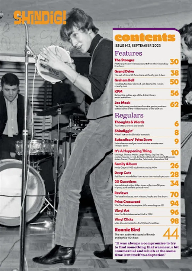 Shindig! is an eclectic cornucopia overflowing with obscure TV and film, psychedelia, folk, garage rock, folk rock, progressive rock, funk and soul. Contributions from its team of international expert writers ensure that new and intriguing tales about influential artists fill every issue. Shindig has established itself as a cutting edge forum and critique of the glories of 60s and 70s music, film and culture.